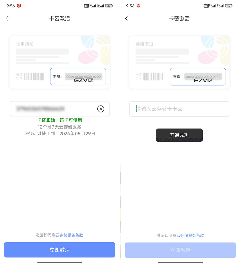 购买云存储卡卡密后,打开莹石APP,按下面步骤输入云存储卡卡密即可激活: