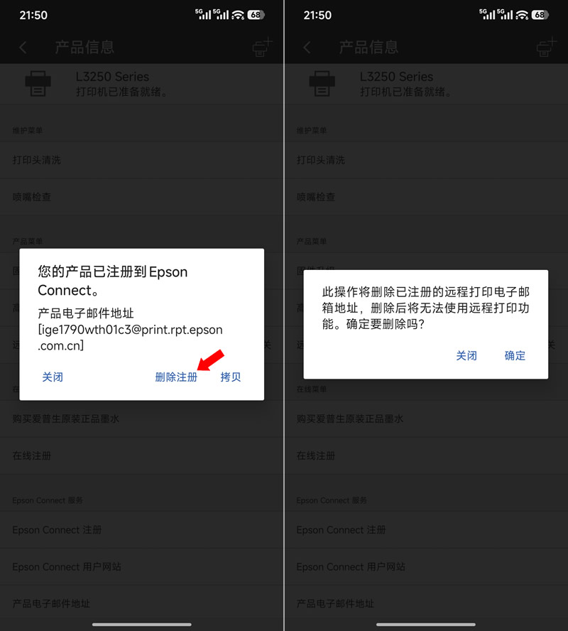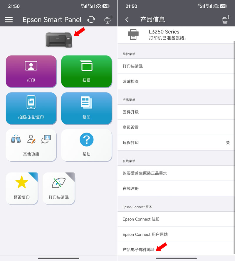 在打印机放一张空白纸,使用Epson Smart Panel将打印机接入Wi-Fi网络(参考这里),再按下面步骤操作即可删除并重新注册远程打印电子邮箱地址: