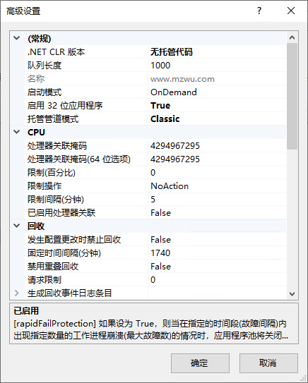找到你的网站所使用的“应用程序池”,右键选择“高级设置”,进行以下调整: