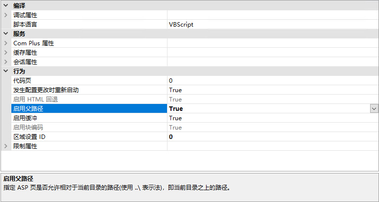 在 IIS 管理器中,点击你创建的网站,双击中间的“ASP”功能图标,进行如下设置: